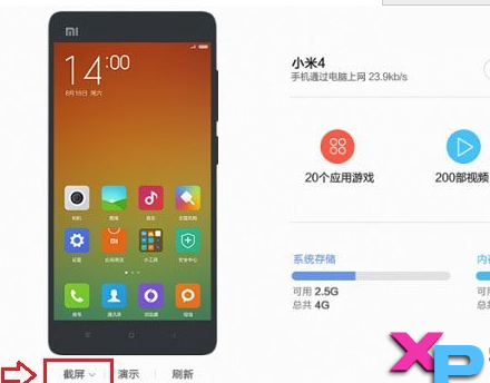 除了可以直接在MIUI 6手机中截图外,还可以将小米手机连接电脑,然后在电脑中下载安装小米手机助手,待小米助手识别到小米手机后,在小米助手界面中,就可以看到“截屏”选项了,点击该项就可以截图,如下图所示。