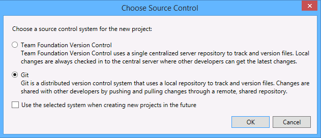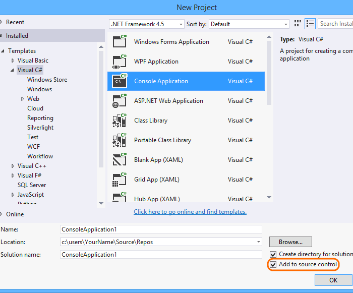 选择一个模板并将新代码项目添加到版本控制。建议您将新项目放在 c:\Users\YourName\Source\Repos\ 中。