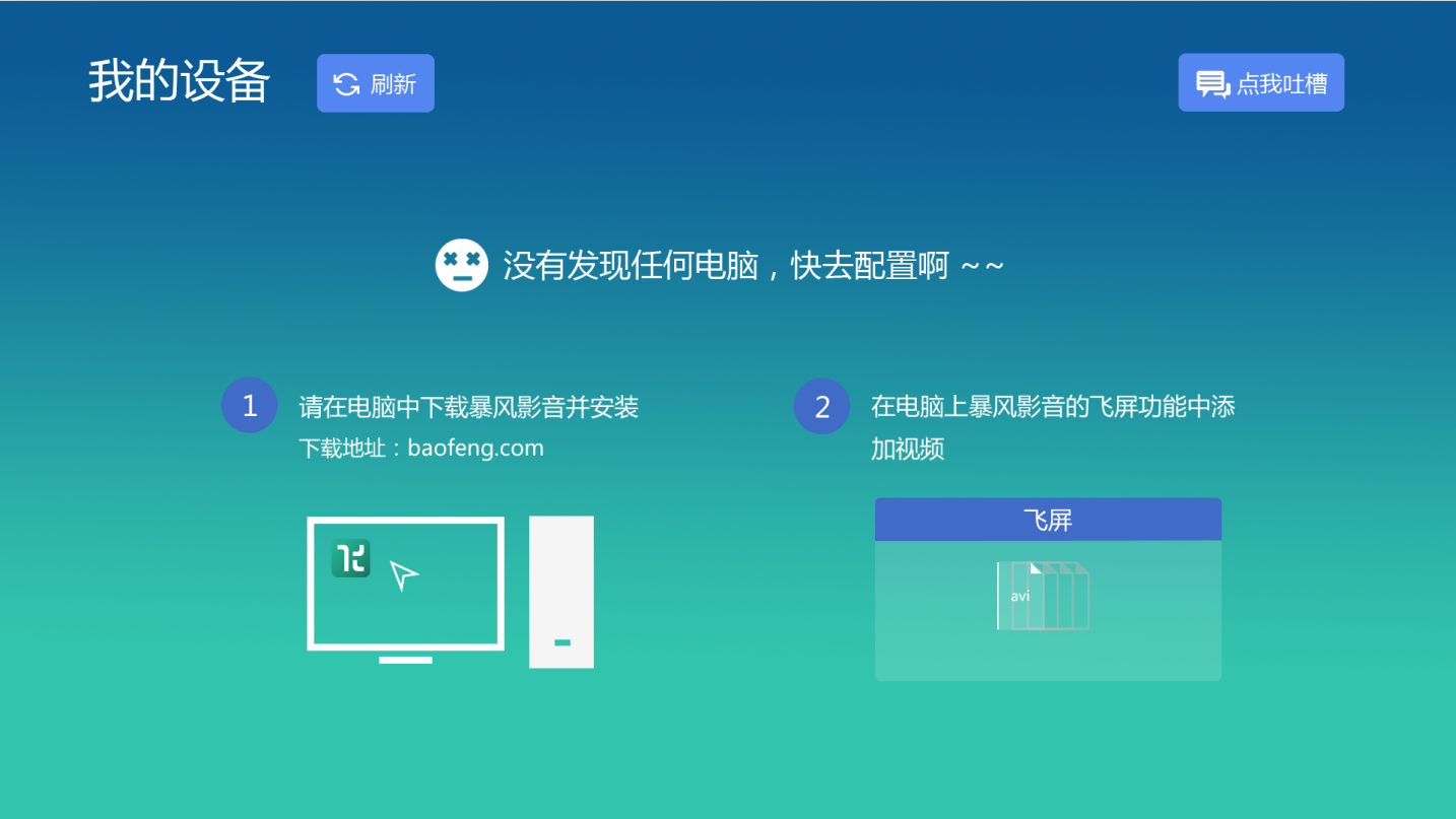 3、在电视中打开暴风影音电视版,进入飞屏功能,将自动刷新并在左侧列出可连接电脑列表,右侧界面为各电脑中所含的媒体种类。若未搜索到您的设备,可以点击“刷新”重新搜索。