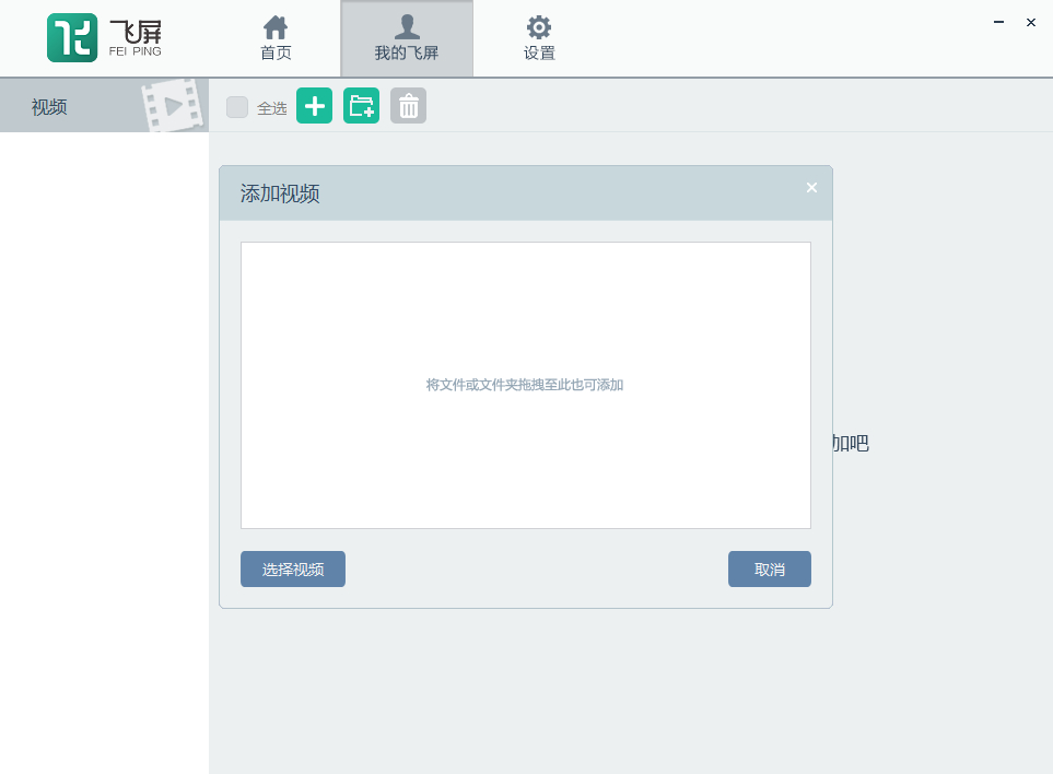 按钮,弹出添加视频的面板。您可以直接将视频文件拖拽至面板中,或点击“选择视频”按钮选择视频。被拖拽或被选择的视频将出现在面板的列表中。您可以一次添加多个视频文件。添加完毕后,点击面板上的确定按钮,列表中的视频就会被添加至飞屏中。