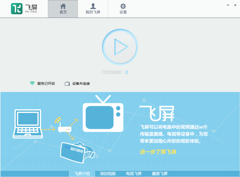 4、暴风魔镜、智能电视设备连接电脑后,可以在飞屏首页看到连接状态。您可以点击设备后面的“断开”按钮,主动断开已连接的设备。