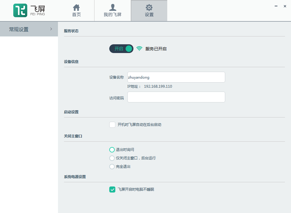 仅关闭主窗口,后台运行:选择此项后,您每次关闭飞屏时不再询问,直接关闭主窗口,但飞屏将仍在后台运行,其他设备仍可连接和使用。