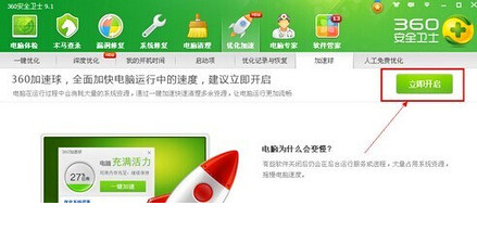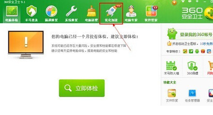 在360安全卫士9.1版本中进入界面,点击进入优化加速版块。