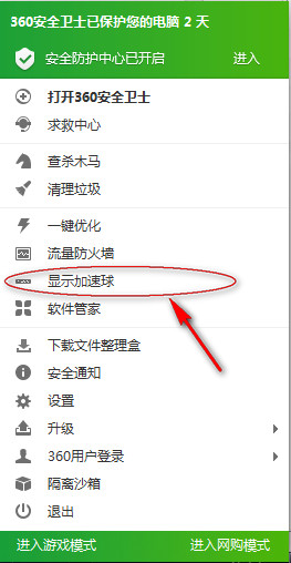 在最新的360安全卫士9.7版本中右击桌面右下角任务栏中360安全卫士的小图标,点击显示360加速球即可打开。