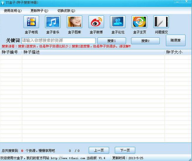 TT盒子种子搜索神器是一款集影视搜索,音乐搜索,图片搜索于一体的资源搜索工具,经小编亲测,搜索1速度快,但是种子资源相对少一些,搜索2速度慢,但是资源很多——那么问题来了,如何使用TT盒子种子搜索神器搜到自己想要的东西呢?下面小编就为大家带来TT盒子种子搜索神器使用图文教程,希望对大家有所帮助!