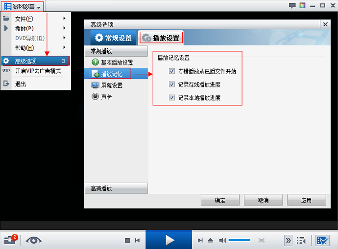 进入主菜单—高级选项—播放设置-—播放记忆中查看您是否勾选 “专辑播放从已播文件开始”、“记忆在线播放进度”、“记忆本地播放进度”。