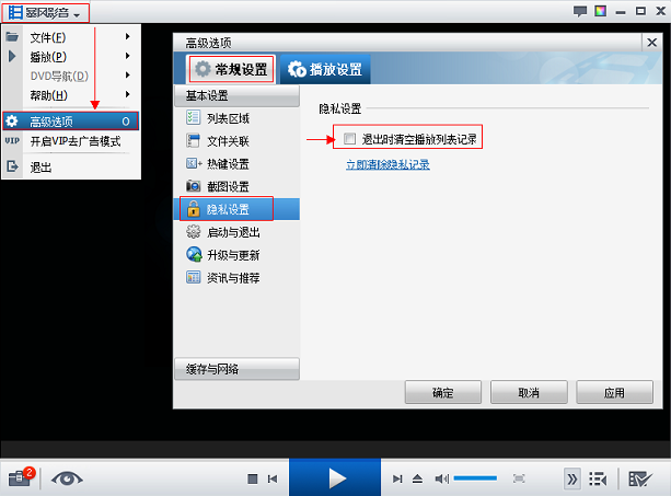 再进入主菜单—高级选项—常规设置—隐私设置中,查看您是否勾选“退出时清空播放列表”。
