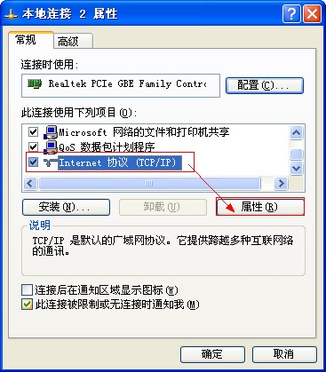 3、选择“Internet协议(TCP/IP)”,单击“属性”打开。(或者双击该协议名称)