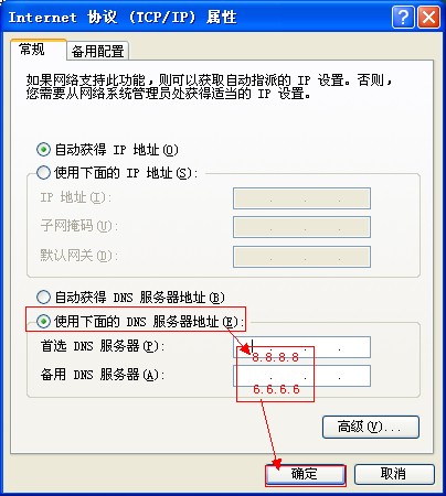 5、勾选“使用下面的DNS服务器地址”,首选设置为8.8.8.8,备选设置为6.6.6.6。IP设置不动,保持原有状态即可。