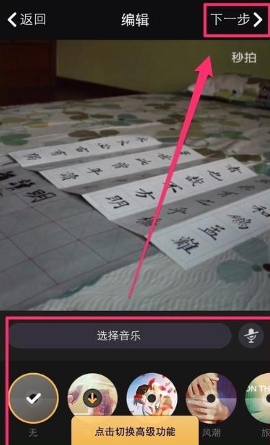 5、在页面下方,有音乐、多种高级功能编辑选项,根据自己喜欢的风格对视频进行个性化操作。完成后选择“下一步”按钮点击进入。