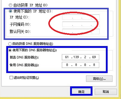 5、接下来我们就可以看到我们熟悉的本地IP地址设置界面了,这里我们选择“使用下面的IP地址”,然后在DNS地址里边也需要填写DNS地址,这里的设置方面就跟以前XP系统介绍的本地IP设置一样了。