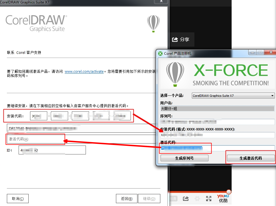 12、再将得到的安装代码,手动输入到注册机的安装代码框中,点击生成激活代码;