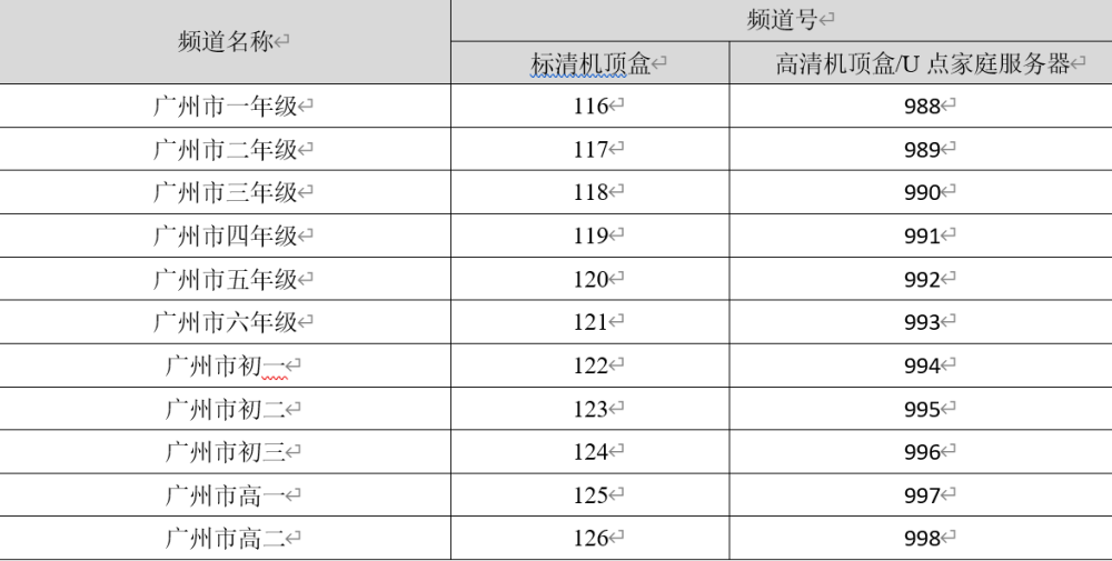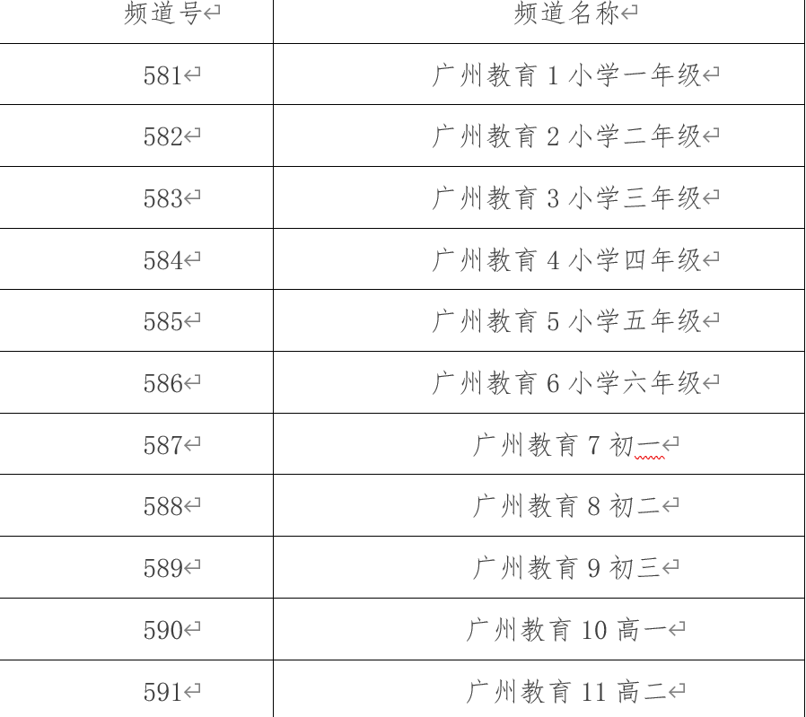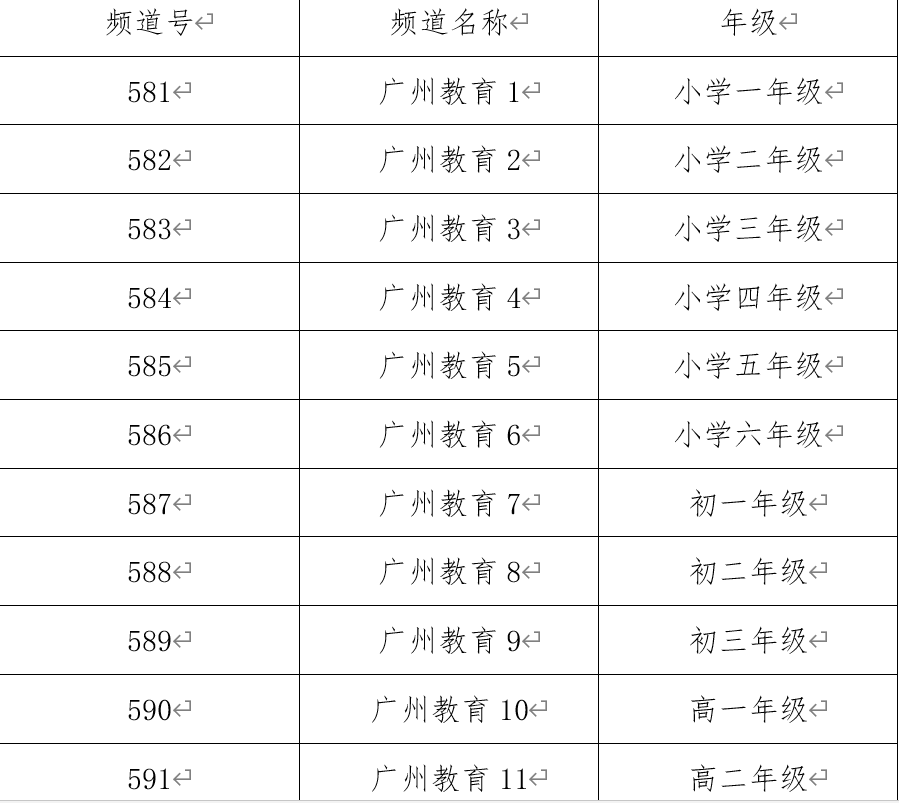 各年级课程内容均由指定电视频道播出,分别对应中小学各年级的课程内容,频道号如下: