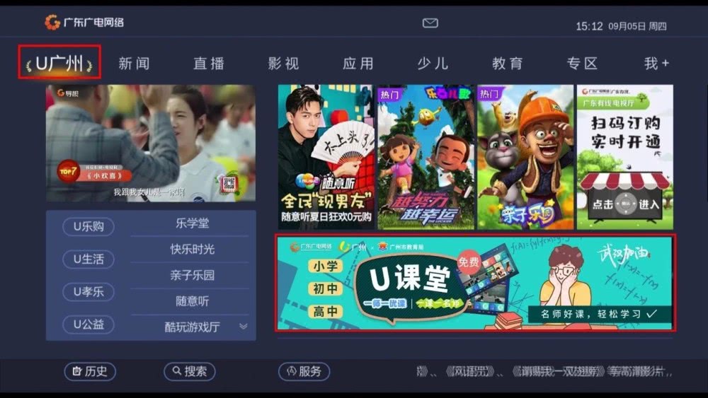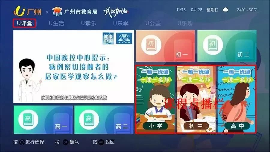 为满足部分学生在直播时间之外收看课程内容的需要,广东有线在“U广州”栏目的“U课堂”专区提供全部课程内容点播。
