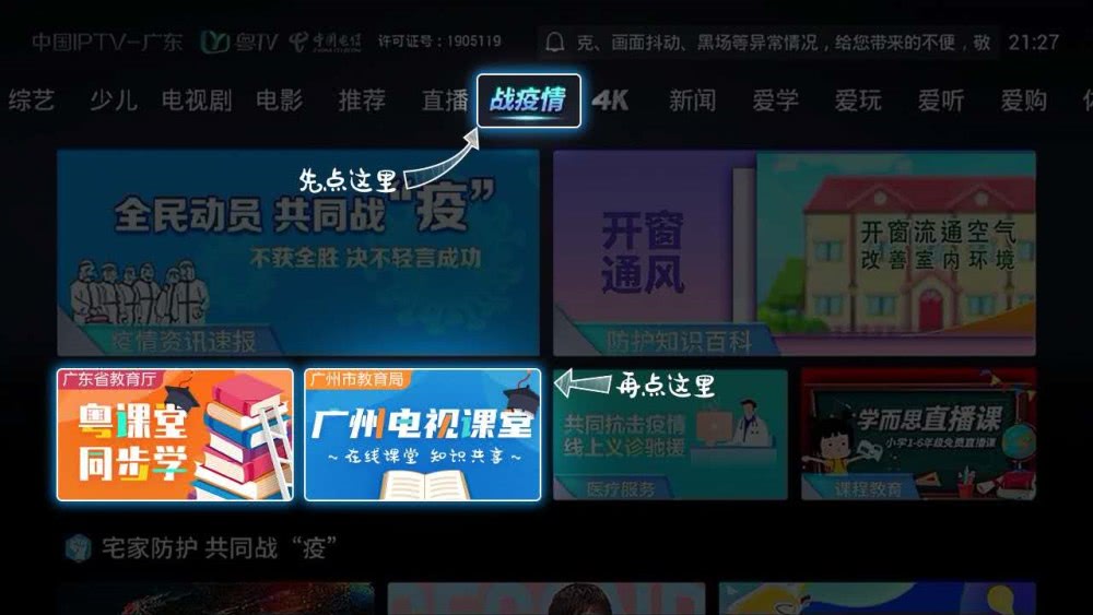 方式三:打开IPTV进入首页,右移至【战疫情】栏目,选择【广州市教育局】点击进入。