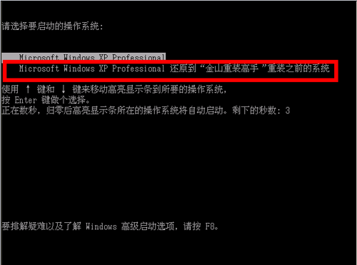 方法一:重启电脑,在进入操作系统时,会有如下提示,选择"还原到金山重装高手重装之前的系统"回车即可,重启后会自动进入还原。