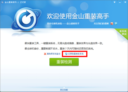 方法二:打开"金山重装高手",点击“还原到重装前系统”,如图所示