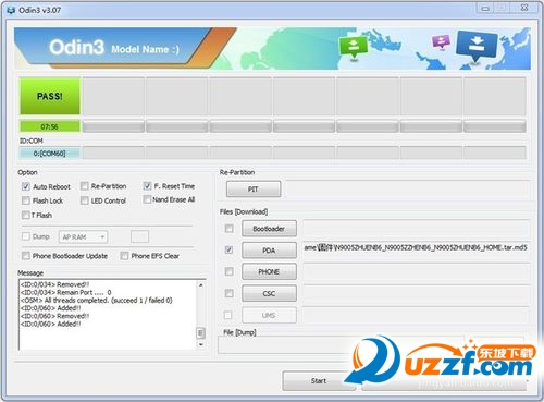 待手机被电脑识别后,运行“Odin3”工具,当工具主界面左上角显示形如“0:COM0”的提示信息时,表明手机被Odin工具正常识别,此时勾选“Auto Reboot”(自动重启)项,勾选“PDA”项, 同时点击“PDA”按钮以选择对应的“tar”或“md5”类型的刷机包,点击“Start”(开始)按钮。