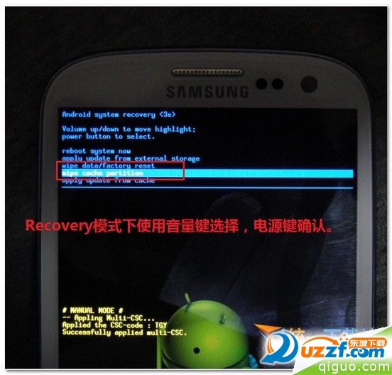 ①手机在关机的状态下同时按住:【音量上、电源键、HOME键】,等待屏幕亮起即可放开。等待手机进入Recovery模式。