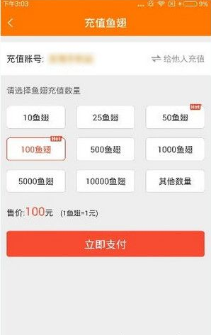 2、然后选择鱼翅充值数量,1鱼翅=1元,点击“立即支付”,如下图;