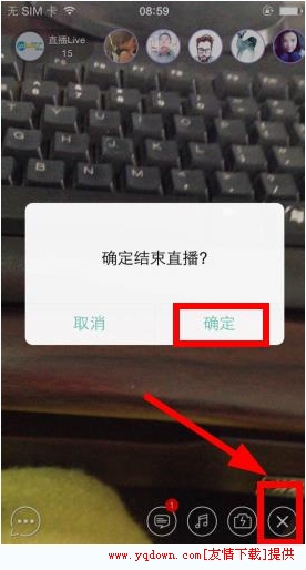 1、在直播完了之后点击右下角箭头所指叉号位置,然后选择确定结束直播直播视频就保存啦。