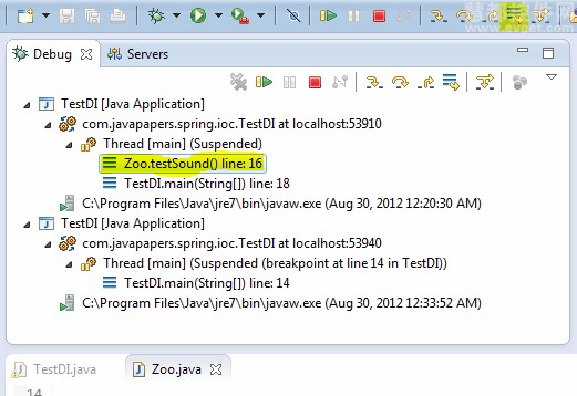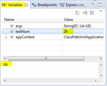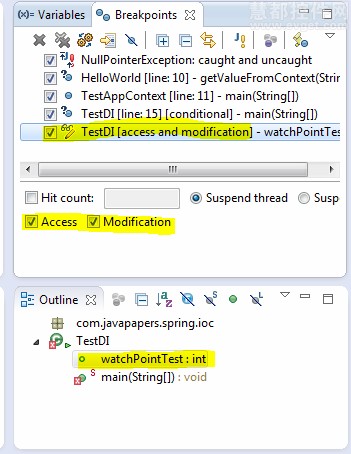 这是一个非常好的功能,当选定的属性访问或修改程序时,程序会停止执行并允许进行调试。在Outline视图中选择一个类变量并从上下文菜单中选择切换监视点,属性监视点将会被创建,在断点(Breakpoints)视图中会把所有监视点用列表的形式显示出来。