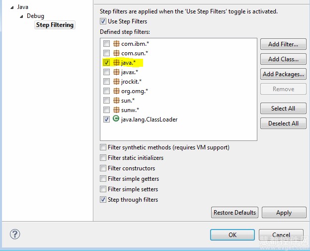 当我们进入(F5)方法的时候,我们还可以访问其外部库(比如JAVA.*),我们可能不需要这个库,就可以在Perference选项卡页面添加一个过滤器来排除这个包。