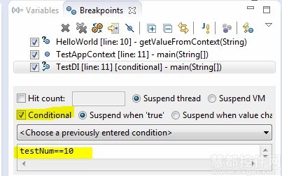 如果你不知道如何添加断点,只需点击左边面板(行号前面)断点即被创建。在调试界面中,“断点”视图会把所有被创建的断点列出来。我们可以给它加一个布尔条件,也就是说,该断点会被激活并且如果布尔条件为真,就会执行该断点,否则将会跳过往下执行。