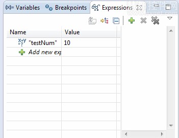 按Ctrl+Shift+D或者Ctrl+Shift+I来显示选定变量或者表达式的值。我们也可以给一个变量或表达式添加永久观察点,当程序在调试时,这些观察点就会在表达式视图(Expression view)中显示出来。