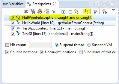 在断点视图中,有一个J!标记按钮!我们可以使用该按钮来添加一个Java异常断点。例如,我们想让程序在遇到空指针异常(NullPointerException)时,仍然能继续调试,那么我们可以使用该按钮来添加一个异常断点!