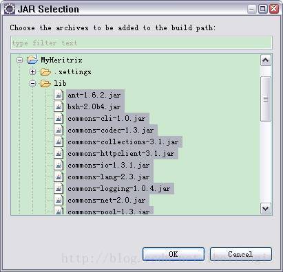 3)在弹出的“JAR Selection”对话框中选择 MyHeritrix 工程 lib 文件夹下所有的 jar 文件,然后点击 OK 按钮。如图 2 所示。