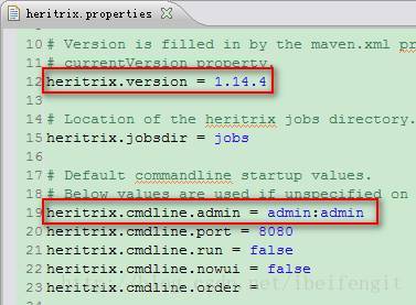 conf 文件夹是用来提供配置文件的,里面包含了一个很重要的文件:heritrix.properties。heritrix.properties 中配置了大量与 Heritrix 运行息息相关的参数,这些参数的配置决定了 Heritrix 运行时的一些默认工具类、Web UI 的启动参数,以及 Heritrix 的日志格式等。当第一次运行 Heritrix 时,只需要修改该文件,为其加入 Web UI 的用户名和密码。如图 5 所示,设置 heritrix.cmdline.admin = admin:admin,“admin:admin”分别为用户名和密码。然后设置版本参数为 1.14.4。