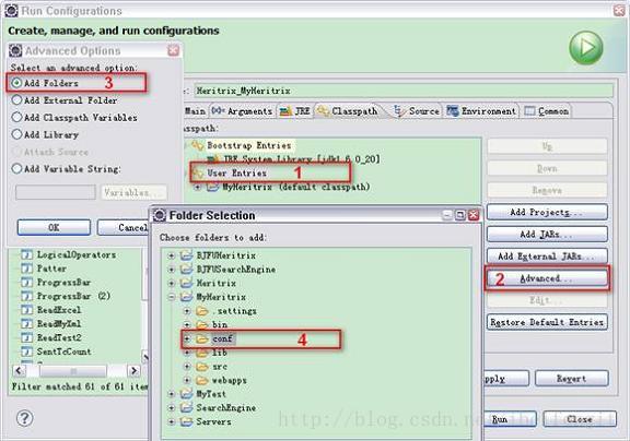 然后在 Classpath 页选择 UserEntries 选项,此时右边的 Advanced 按钮处于激活状态,点击它,在弹出的对话框中选择“Add Folders”,然后选择 MyHeritrix 工程下的 conf 文件夹。如图 7 所示。