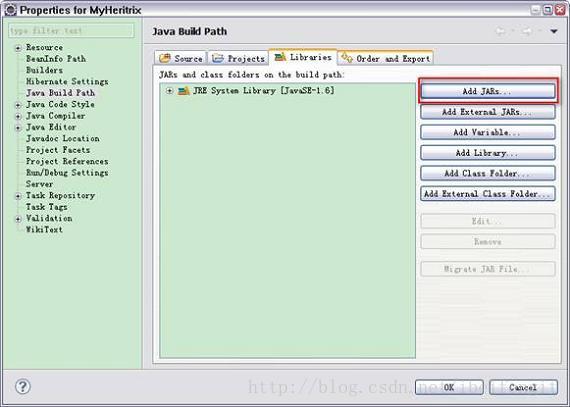 2)在 MyHeritrix 工程上右键单击选择“Build Path -> Configure Build Path …”,然后选择 Library 选项卡,单击“Add JARs …”,如图 1 所示。