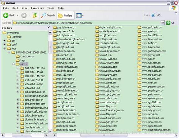 同时,在 MyHeritrix 工程目录下自动生成“jobs”文件夹,包含本次抓取任务。抓取下来网页以镜像方式存放,也就是将 URL 地址按“/”进行切分,进而按切分出来的层次存储。如图 17 所示。