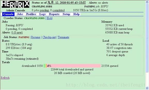 Heritrix 使用 Web 用户界面来启动、设置爬行参数并监控爬行,简单直观,易于管理。下面我们以北京林业大学首页 (http://www.bjfu.edu.cn/) 为种子站点来创建一个抓取实例。