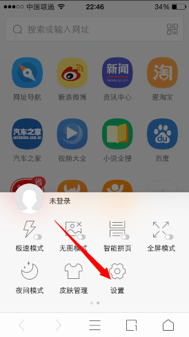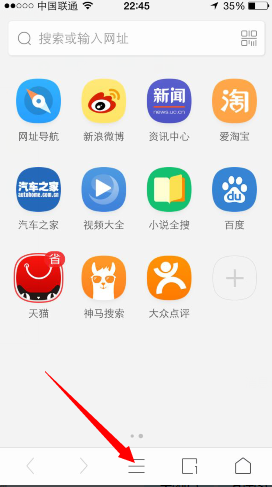 1、进入UC浏览器点击下放正中间的菜单功能键,效果图如下: