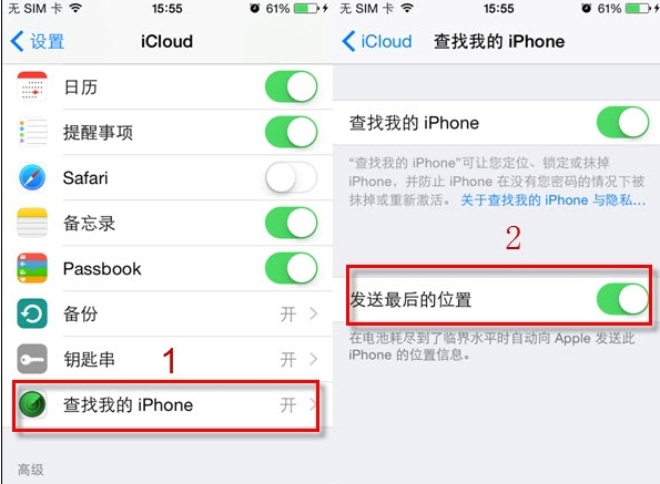 点击“查找我的iPhone”一项进入,再开启“发送最后的位置”一项。