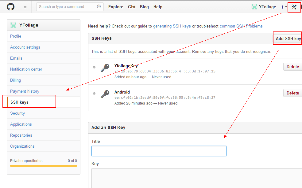 生成 SSH 的 public key在GitHub中通过:edit your profile -> ssh key -> Add SSH Key 添加SSH Key, 把上面生成的 public key 拷贝到这里,保存。
