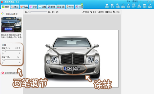 3、现在在左边调节适当的画笔大小和力度,然后在需要被马赛克的部分涂抹即可,如下图涂抹车牌一样。