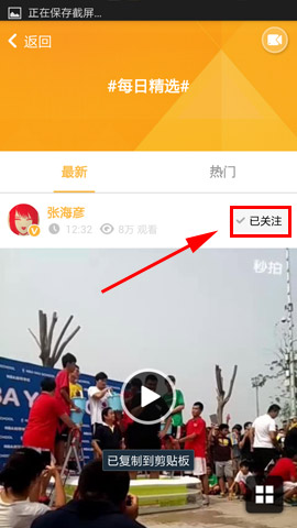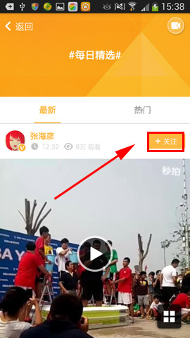 2)在发现面板中点击【视频】进入该视频界面后,点击【关注】即可。(如下图)