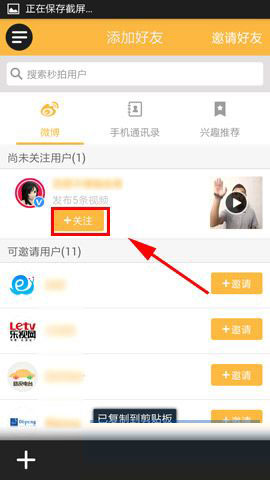 2)根据所需可以选择【微博】【手机通讯录】【兴趣推荐】等方式添加好友,小编这里以【微博】为例,根据所需加【关注】即可。(如下图)