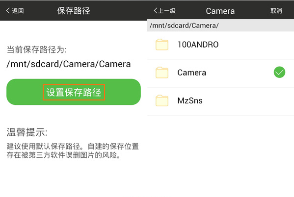 2、点击“设置保存路径”,大家就可以修改图片保存的路径了,把照片放在自己喜欢的文件夹里,如果想另起一个文件夹来保存美图秀秀的图片,还可以点击底部栏的“新建文件夹”。