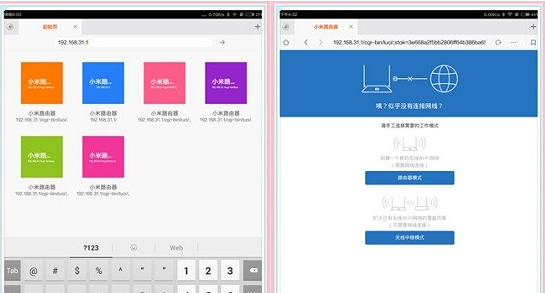 第三步,在上面连接上路由器后,如果是第一次连接,手机或者平板会自动用浏览器打开路由器的设置页面,如果没有自动打开,大家可以用手机或者平板的自带浏览器输入192.168.31.1打开相应的页面。