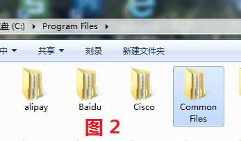2、在C盘中找到”Common Files"文件夹,如图2,点击打开后找到“Baidu“文件夹。如图3。再次点击打开此”Baidu”文件夹。(如果没有进行第一步所说的在控制面板--程序中卸载过,在进行第二步操作时,需要退出百度卫士使用,即关掉百度卫士。或是先在程序中卸载一次百度卫士。)