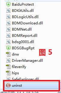 3、打开上面提到的“Baidu”文件夹后,找到“BaiduProtect"文件夹。如图4,点击打开。里面会有一个安装百度卫士的本版号文件夹,再点击打开后,出现一系列文件夹及文件列表,找到”uninst"文件,如图5。此文件一般在列表的下方。