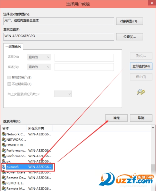 点击高级后,我们接着在点击立即查找,然后在查找结果里找到当前用户的账号,选中后点击确定,如下图所示。(注意看头像:一般是一个人的,两个人是指的共享用户)