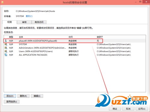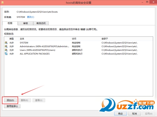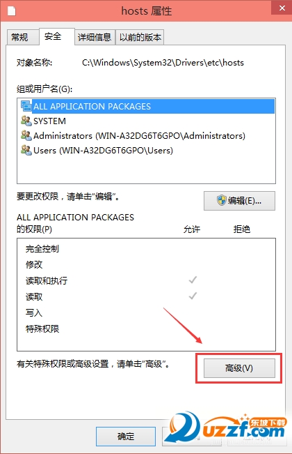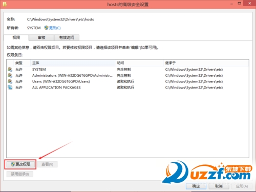 在hosts的高级安全设置界面点击更改权限,如下图所示。