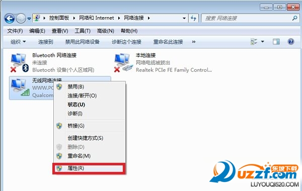 1、进入电脑【控制面板】-【网络连接】,然后在已经连接的网络上,点击鼠标右键,在弹出的菜单中,点击打开【属性】,如下图所示。