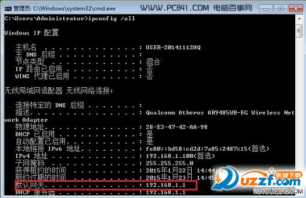 如果是以前修改了路由器设置界面地址,现在忘记了怎么办?其实也很简单,只要在还可以联网的状态,打开cmd命令框,然后键入ipconfig /all,然后就可以查看到目前的路由器IP地址,如下图所示。